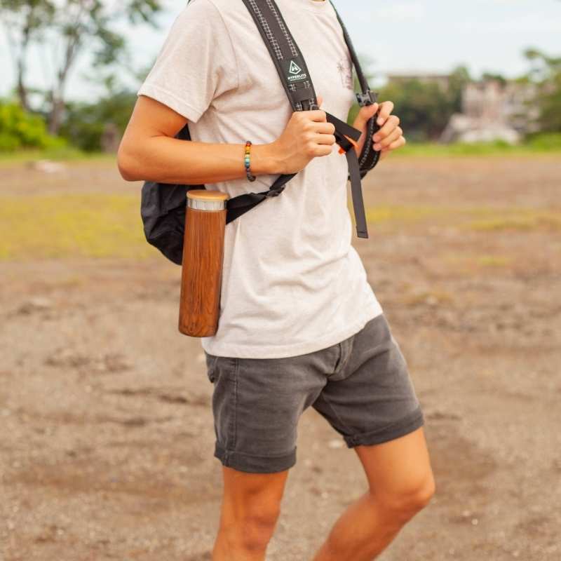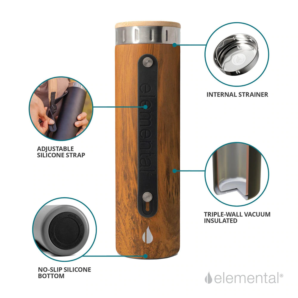 The Iconic 20oz. Water Bottle features an attractive teak exterior, double-walled insulation, an internal strainer, and a silicon strap for easy transport. The strainer is perfect for loose leaf tea or drinks that need shaking like protein powders, and the double-walled insulation will keep your coffee hot and your water cold. Put simply, it’s the only bottle you’ll ever need.
