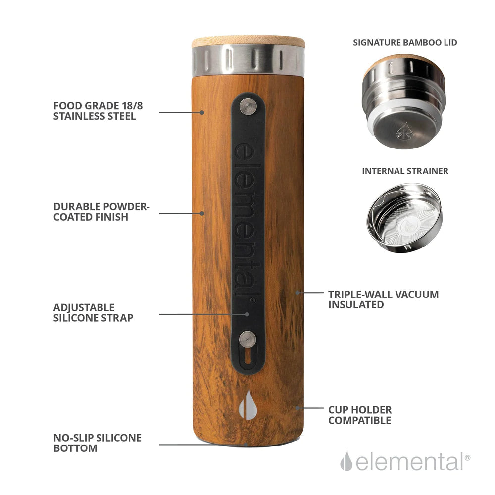 Classic Elemental Stainless Water Bottle - Teak Wood Bamboo Cap 20 oz.