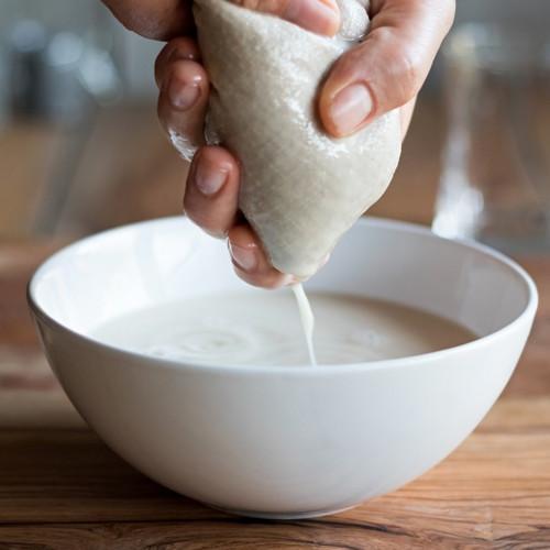 Featuring a fine weave cotton fabric with a thick cotton drawstring, this bag allows you to strain milk easily. You can even hang the bag to let it drain.