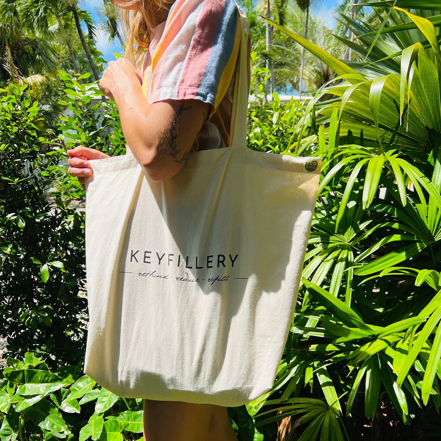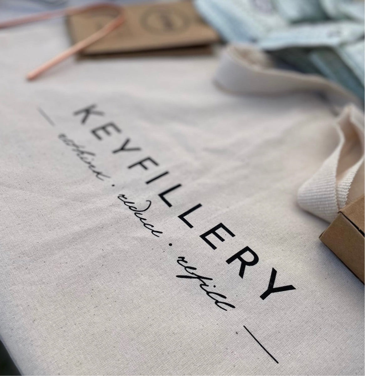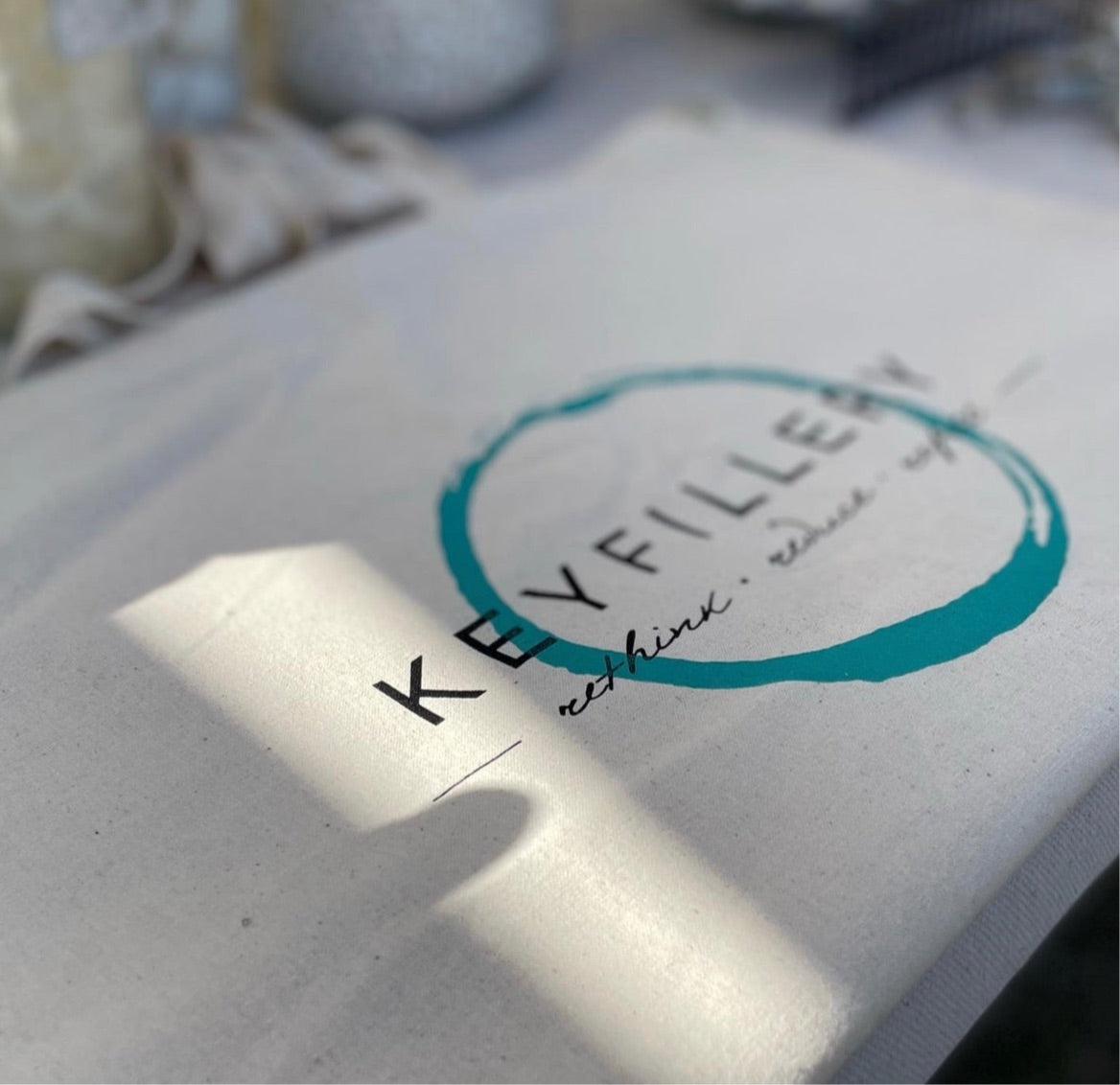 Available with the traditional black Keyfillery logo or spice things up with the watermark logo. I like to think of it as a water ring from a mason jar? Either way, you will fall in love with this must-have-on-the-go-tote.