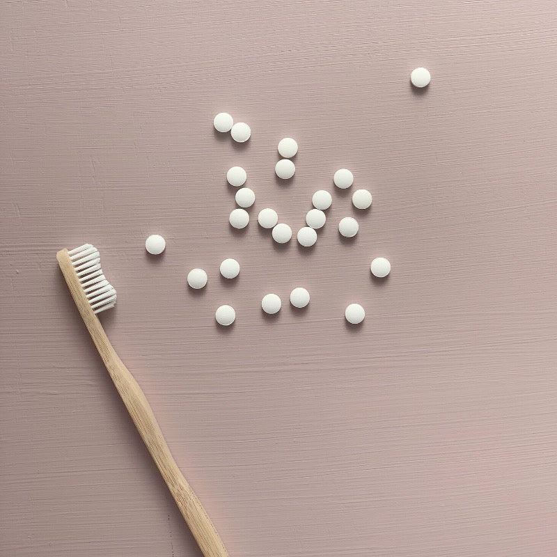 No more non-recyceable toothpaste tubes! With toothpaste tablets you just pop one in your mouth, crush, and brush with a wet toothbrush. The wetness from your toothbrush plus the saliva in your mouth create a paste-like consistency and then you just brush like you always would!