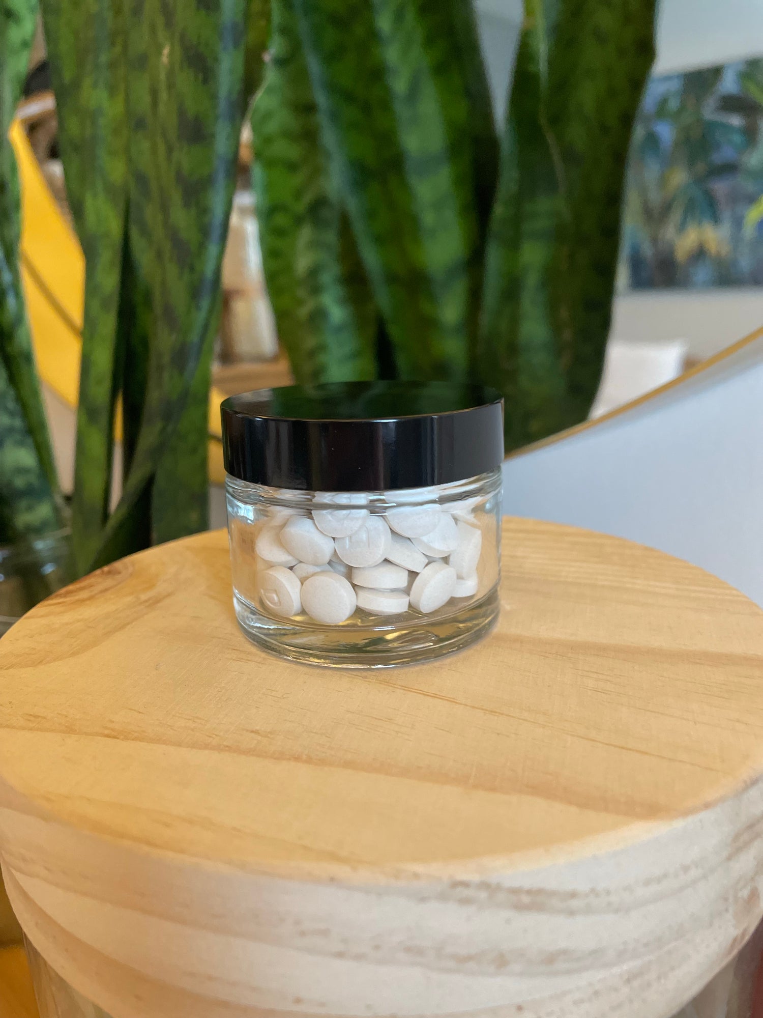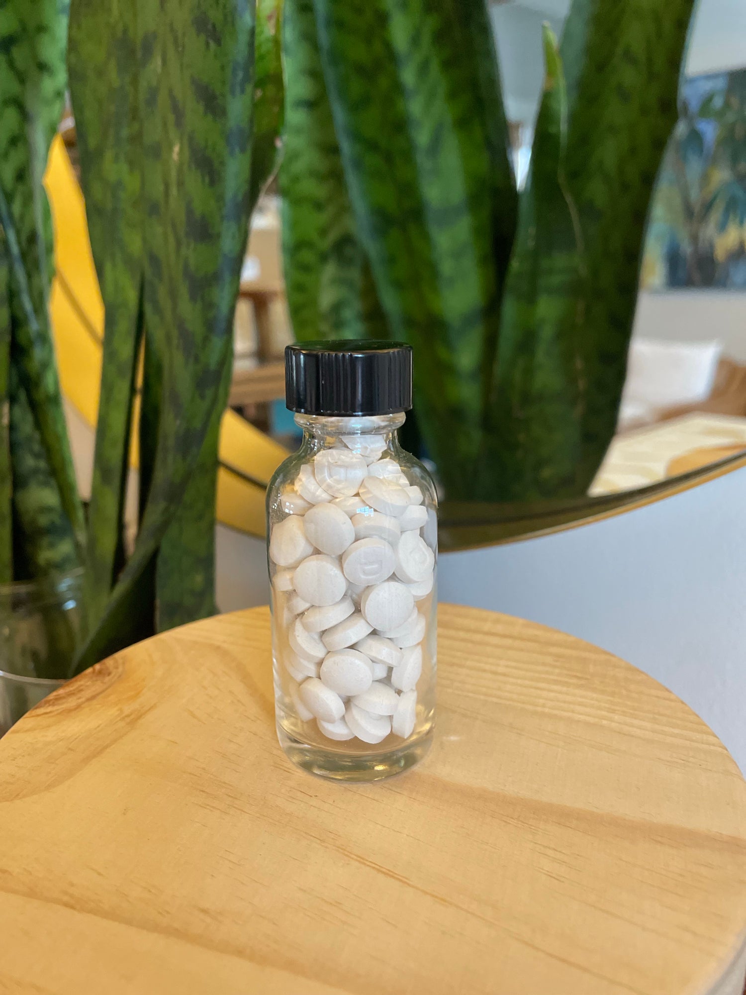 The item is a 1 ounce jar of toothpaste tablets (approximately 90 tablets, prefilled in-house). Comes in a reusable glass jar with a twist lid.